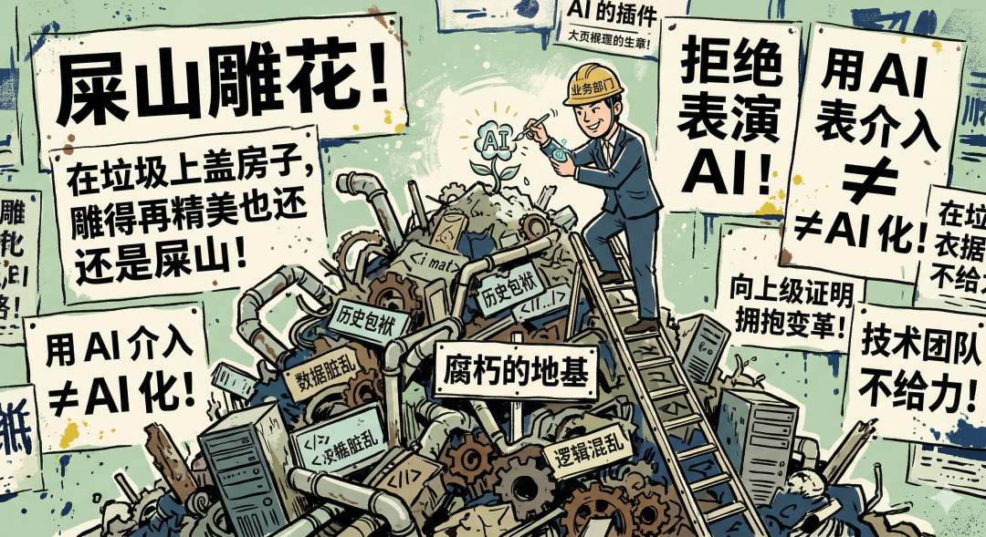 这些系统往往是积年累月的"史山"——流程复杂、逻辑混乱、充满历史包袱。业务部门的想法是:只要让 AI 介入,系统就"AI 化"了,我们就能向上级证明自己在拥抱变革。